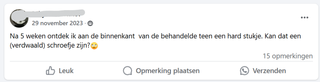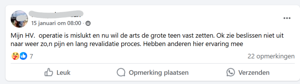 Een mislukte hallux valgus operatie is natuurlijk enorm balen. Gelukkig zijn er meestal nog verschillende behandelopties mogelijk. Het belangrijkste is dat je op tijd aan de bel trekt als je denkt dat er iets niet goed is. Hoe sneller problemen worden aangepakt, hoe groter de kans op herstel.